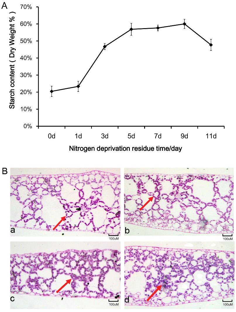 图2 缺氮处理下浮萍淀粉积累的示意图