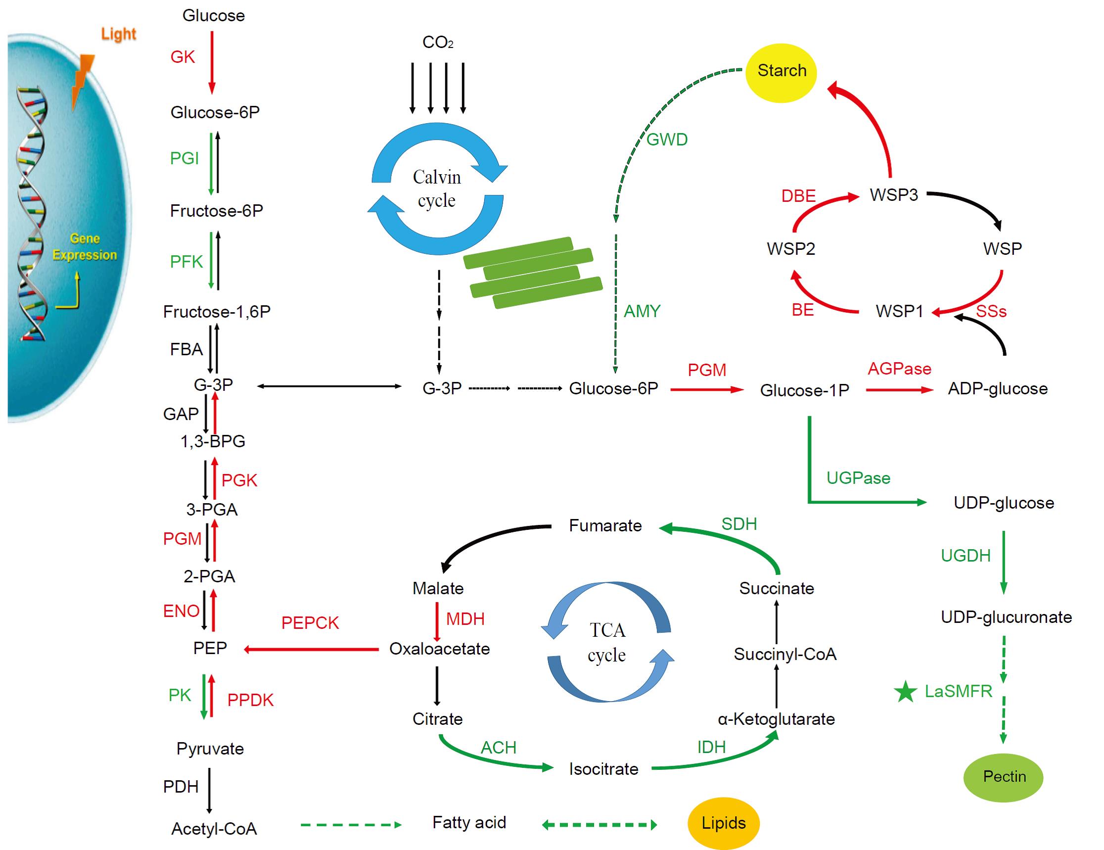 浮萍具有快速生长和高效积累淀粉的特性,因此它既是一种未来生物燃料最具有发展潜力的战略性能源植物之一,又是一种研究植物高效积累淀粉分子机制的理想模式体系。青岛能源所周功克研究团队利用了转录组、代谢组及其相关酶活测定等方法,挖掘了浮萍高效积累淀粉的关键基因,构建了缺氮处理下浮萍淀粉高效积累的示意图,解析了浮萍代谢流的重新分配途径,即缺氮处理后,底物Glu-1P更易流向淀粉合成途径,而分支途径果胶的生物合成受阻,最终导致浮萍淀粉大量积累,从而进一步解析了浮萍淀粉高效积累的分子机制。该研究不仅为提高浮萍淀粉资源提供了理论与实践,也为淀粉类作物改良提供理论基础和技术支持。