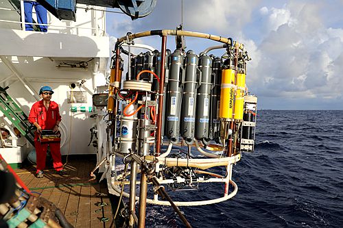 搭载高通量深海海水采样及分级过滤系统的CTD准备下水
