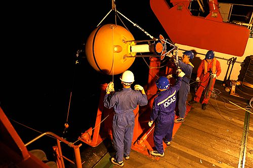 凌晨1点52分,城市里的万家灯火也早已沉寂的时刻,“科学”号的后甲板却又一次灯火通明,工程技术部船载实验室主任孙宇峰带领值班人员开始了混合潜标布放。“科学”号多次执行潜标布放任务,已形成了一套职责分工明确、配合紧密流畅的作业流程,2点50分主浮球下水,混合潜标顺利布放完毕。这就是海洋科考,没有昼夜之分,随时准备工作。