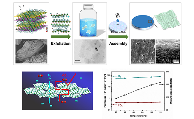 然而制备结构稳定的金属有机骨架纳米片难度大,工艺过程复杂,这严重阻碍了二维MOF纳米片膜的后续发展。为解决此问题,该团队在上述研究成果基础上,选择了一种全新的两亲性层状MOF前驱体Zn2(Bim)3,首次将此前驱体开层,得到双层厚度纳米片,并通过前期开发的热组装方法制备了厚度<10 nm的超薄MOF纳米片膜。该膜对H2/CO2混合气体具有极佳的分离性能,且不同于其它二维纳米片膜材料,该膜随着测试温度的升高,在CO2透量维持不变的情况下,其对H2透量可升高至8 10-7 molm-2s-1Pa-1,分离系数可达166。该项研究在CO2燃烧前捕获领域具有很好的应用前景。由于材料具有独特的亲水亲油性,该纳米片材料也十分有望拓展到催化及电化学研究领域。