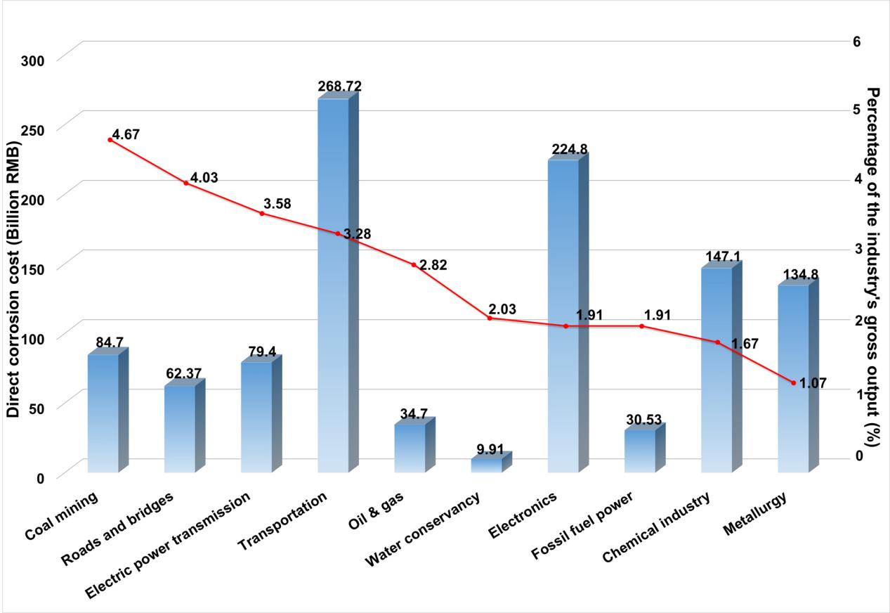 The direct costs of corrosion of ten leading industries in China in 2014