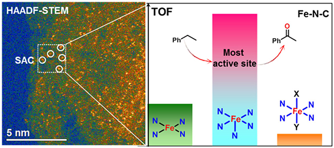 M-N-C催化剂(M = Fe, Co, Ni, etc.)被广泛应用于电化学反应(如ORR,HER,CO2RR)和有机化学反应中,因其优异的催化性能有望成为一种替代Pt族金属的非贵金属催化剂。但由于M-N-C催化剂的组成较为复杂, 对其活性中心的认识存在诸多争议。而单原子分散的催化剂由于避免了M0, MOx, MCx等纳米颗粒的干扰,为活性位的精细结构解析提供了独特优势。此前,该研究团队已经合成出单原子分散的Co-N-C催化剂,并确定其结构为CoN4C8-1-2O2(Chem. Sci., 2016, 7, 5758-5764)。在此基础上,该团队又成功制备出单原子分散的Fe-N-C催化剂,该催化剂在乙苯C-H键选择性氧化反应中的催化活性和选择性可媲美均相催化剂,且具有优异的底物普适性和反应稳定性。更为重要的是,通过XAFS、M ssbauer、EPR和毒化试验首次证明Fe-N-C催化剂中三价铁离子存在多种配位结构(FeNx, x = 4,5,6),其中中自旋的Fe-N5结构具有最高催化活性,而该结构在数量上却仅占18%,说明Fe-N-C催化剂的活性具有很大的提升空间,这对于后续指导人们设计更为高效的Fe-N-C催化剂提供了新的思路。