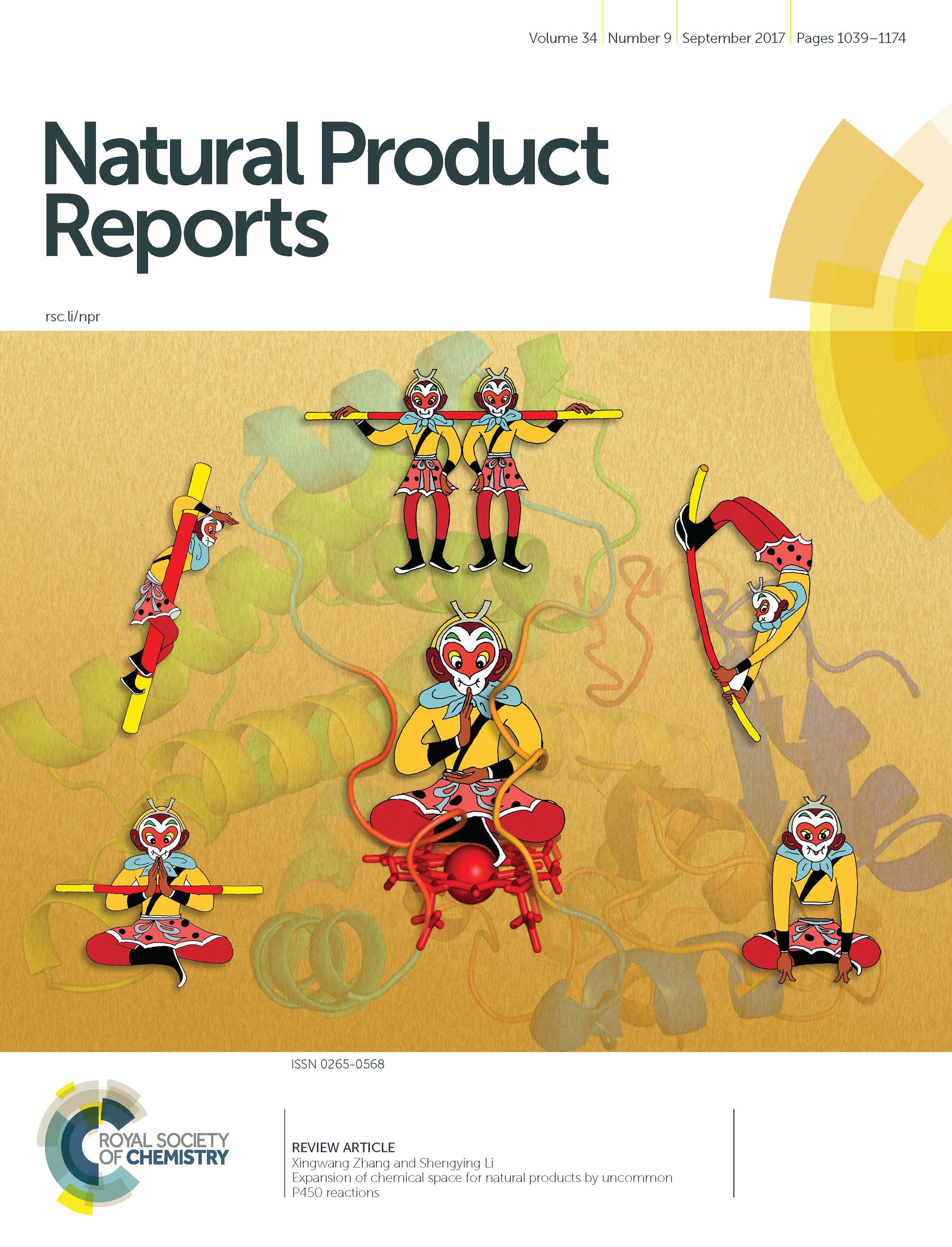 在Natural Product Reports 2017年第9期的封面图片中,李盛英团队从底蕴深厚的中国传统文化中选用经典的“孙悟空”卡通形象及其“七十二变”技能,形象比拟了P450酶在拓展天然产物结构多样性中发挥的多变作用。