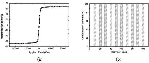 图2 (a) Pd(0.1)/Fe3O4催化材料室温下的磁化曲线;(b) 矿泉水中溴酸根催化还原循环实验中溴酸根的转化率(溴酸根初始浓度50 ppb、处理时间5 min、重复使用100次)。