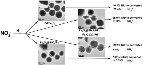 硝酸根催化还原的主要产物是氮气(目标产物)或者铵根(副产物),其产物选择性主要是由反应第二步亚硝酸根的还原所决定。高分散的超顺磁性Fe3O4纳米球能够为亚硝酸根提供还原活性位,会降低还原产物对于N2的选择性。为解决此问题,他们以Fe3O4纳米球为核,分别用SiO2、PMAA和C纳米薄层为保护壳,构筑出核壳结构作为Pd纳米催化剂载体,研究了它们的催化还原亚硝酸根能力。因为保护壳能够显著降低乃至完全抑制Fe离子的泄露与亚硝酸根在Fe3O4上的还原,这些核壳结构负载Pd纳米催化剂与无保护壳的Fe3O4/Pd纳米催化剂相比具有大大增强的催化还原亚硝酸根活性,而且大大降低了还原产物对于铵根副产物的选择性。在这三种保护壳中,SiO2壳具有最好的保护性能。Fe3O4@SiO2/Pd纳米催化剂避免了传质过程的限制、孔结构中pH梯度以及Fe3O4对亚硝酸根还原过程的影响,整个反应过程中无副产物铵根产生,展示出很高的亚硝酸根催化还原能力和良好的重复使用稳定性(ACS Applied Materials & Interfaces, 2016, 8, 2035)。
