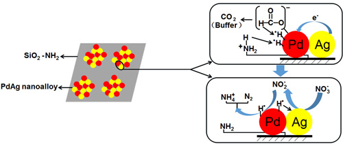 目前,催化还原去除水中致癌阴离子主要以氢气作为还原剂。氢气在运输、存储与使用过程中都可能存在安全隐患,对于催化还原处理方法的实际应用在生产安全方面带来不确定性,阻碍了它的广泛应用。因此,有必要发展新型催化还原净水材料,通过新的反应路径的设计,解决该安全隐患问题。在近期工作中,他们采用甲酸作为还原剂前驱物,在贵金属的催化作用下,甲酸能原位分解为氢气和二氧化碳,产生的活性氢气作为还原剂实现硝酸根的催化还原,而二氧化碳则可以作为一种缓冲剂起到调节反应体系pH值的作用,提高催化还原的反应效果。这样不仅避免了直接使用氢气作为还原剂所带来的安全隐患,同时由于氢气是在催化材料上原位生成,极大提高了还原剂的利用率,提高了整体催化还原反应的效率。为了适应这一新的催化还原反应设计,他们对催化还原净水材料本身做了新的调整,引入银元素对纳米钯颗粒进行功函的调整,进而调整催化还原反应的具体路径,提高了其催化还原的效率以及反应选择性(Applied Catalysis B: Environmental, 2017, 203, 372)。