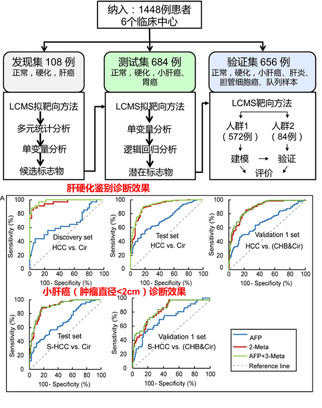 肝细胞癌(Hepatocellular carcinoma,HCC)是世界范围内发病率位居第六、致死率居第三的恶性肿瘤,乙肝病毒感染是肝癌的主要风险因素。我国是肝癌的高发区,降低肝癌发病率、死亡率也是国家科技重大专项的重要目标之一。由于肝癌早期无明显临床症状,发展快且易转移,临床发现时大多已是中晚期,临床治疗效果不佳。为解决这一难题,急需发展新型、稳定可靠的方法实现肝癌的早期筛查。针对此问题,该研究团队联合了包括吉林大学附属第一医院,第二军医大学东方肝胆外科医院,华中科技大学同济医学院,厦门大学中山医院,北京大学人民医院,山东省立医院等6家临床相关研究机构,纳入了1448例受试者,受试者中包括健康对照、慢性乙肝肝炎、肝硬化和肝癌等。该研究采用了大连化物所自主开发的基于LC-MS的大规模代谢组分析技术,鉴定和验证了一组新型的肝癌组合代谢标志物:甘氨酸胆酸、苯丙酰色氨酸。大规模临床验证结果显示,该组合标志物能够有效的在高风险的肝硬化患者人群中发现肝癌患者,其受试者操作特征曲线下面积(AUC)达到0.807-0.930,优于传统的肝癌临床标志物甲胎蛋白(AFP)的0.65-0.725,同时与AFP具有较好的互补性。二者联合应用可有效避免AFP阴性肝癌患者的漏诊,联合应用的诊断正确率可达80.6%-100%。