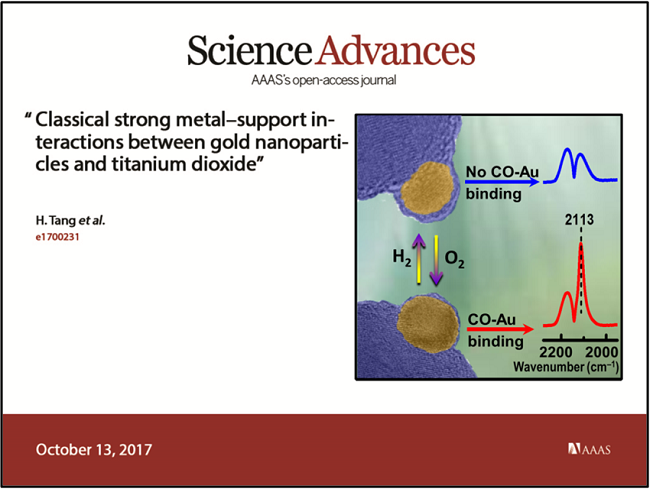 近日,中国科学院大连化学物理研究所航天催化与新材料研究中心乔波涛研究员和张涛院士团队与穆斯堡尔谱技术研究组(DNL2005)王军虎研究员团队合作,在金属载体强相互作用研究方面取得新进展:首次发现金纳米颗粒与二氧化钛之间的金属载体强相互作用并阐释了其形成原因。研究成果在Science Advances(Science Advances, DOI: 10.1126/sciadv.1700231)上发表。