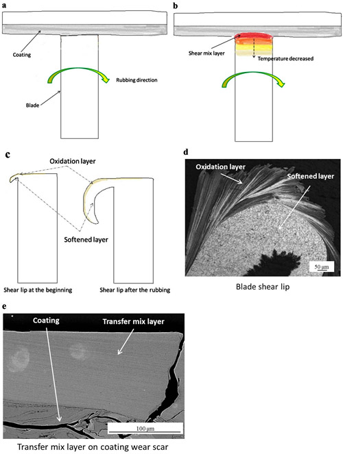 图 GH4169叶片高速刮擦中形成剪切唇的过程(a,b,c),典型剪切唇结构(d)和对摩封严涂层中形成的转移层(e)