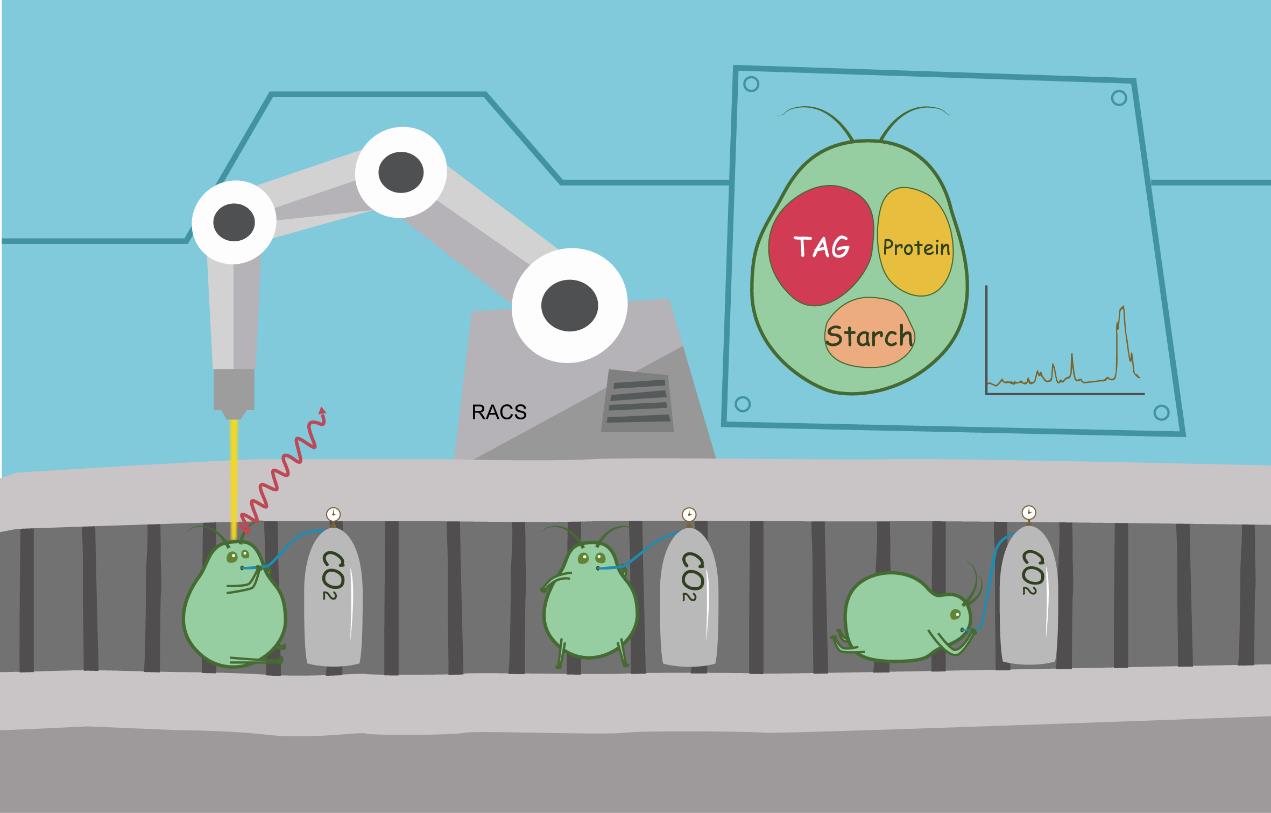 通过光合作用固定的二氧化碳与太阳能在生物体内有三种最主要的存储形式:多糖、油脂和蛋白质,它们共同构成了生物碳存储与生物能源产业的物质基础。但是目前对细胞中这三类高含能储碳分子的识别、表征和定量极为繁琐,而且通常难以在单个细胞精度测量,这一瓶颈限制了光合固碳细胞工厂的筛选与改造效率。青岛能源所单细胞中心发明了基于“拉曼组”的单细胞快检技术,能够在单个细胞精度同时测量淀粉、甘油三酯、蛋白质含量以及油脂不饱和度,为细胞工厂的性能测试平台增添了一个崭新手段。该工作于11月19日在线发表于Biotechnology for Biofuels。