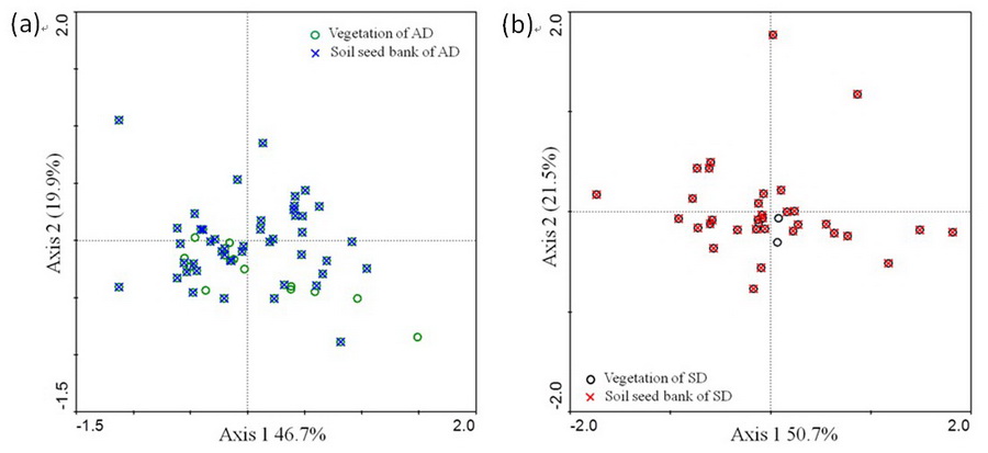 图1. 流动沙丘和固定沙丘丘间低地植被和土壤种子库物种组成的DCA分析