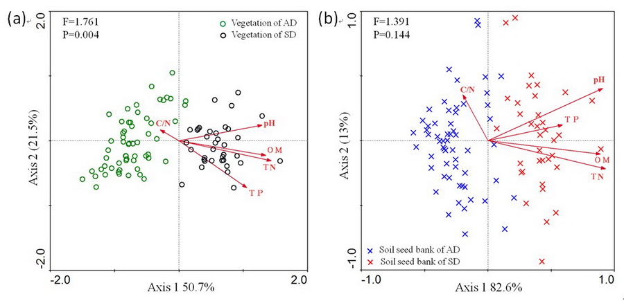 图2.流动沙丘和固定沙丘丘间低地植被和土壤种子库物种组成与土壤环境因子的CCA和RDA分析
