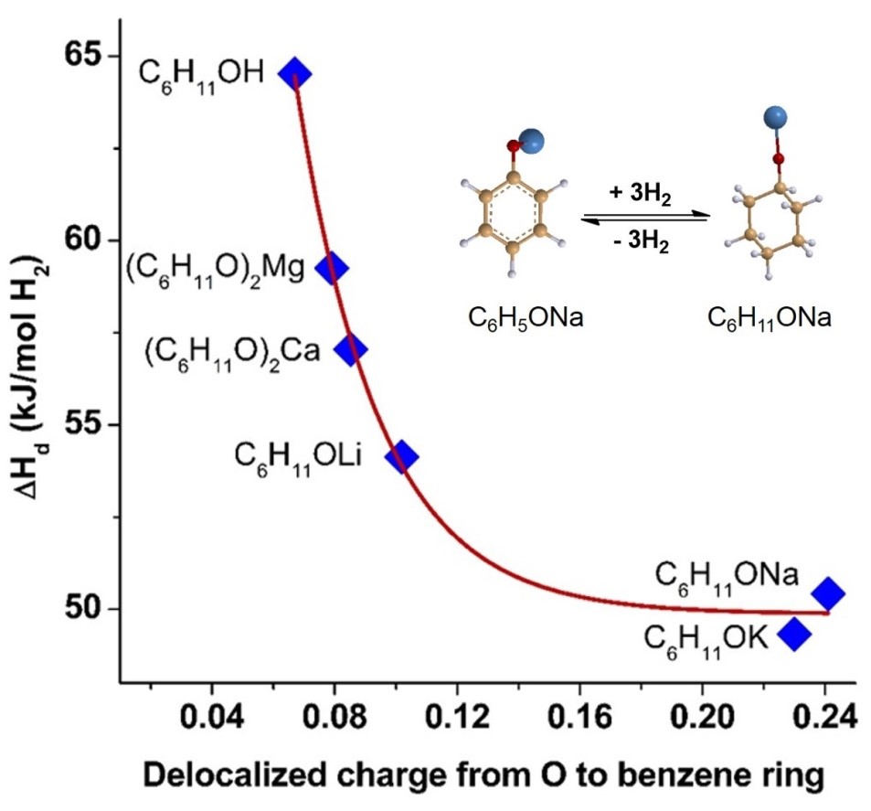 近期,该团队提出一种全新的策略:利用金属的电负性差异,修饰有机储氢材料的电子性质,合成出了一类新颖的有机-无机杂化储氢体系——金属有机化合物。理论计算表明,增加有机碳环中的电子密度,可以显著降低有机物的脱氢焓变,且电子密度越高,脱氢焓变越低,科研人员利用具有较强供电子性质的碱金属或碱土金属改性有机储氢材料,发现其环中电子密度明显增加,从而有效地降低了有机材料的脱氢焓变;同时理论计算还表明,随着金属的供电子性质增强,材料的脱氢焓变越低,即通过选择不同的金属,可以可控地调变材料的脱氢焓变,从而在热力学上控制材料的脱氢温度。本工作以钠修饰的苯酚-环己醇为例,计算发现其脱氢焓变可以从64.5kJ/mol-H2降低为50.4kJ/mol-H2;此外,随着金属给电子能力增强,环己醇钠 位C-H键键长增加,二者成线性关系,这说明材料经过有机无机杂化后,已经被活化,并且脱氢过程中 位C-H键优先断裂。