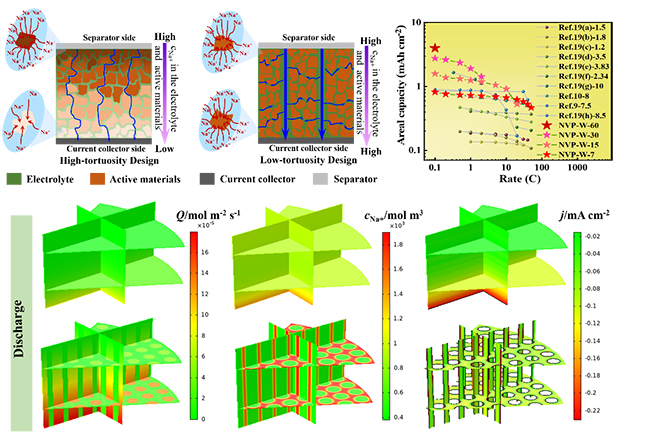 该团队基于非溶剂诱导相转化方法,调控成膜热力学和动力学过程,成功制备出一种具有低弯曲度指状孔的超高面容量(60 mg/cm2,4.0 mAh/cm2)磷酸钒钠基电极结构。在低弯曲度指状孔电极内,一方面钠离子首先沿着指状孔在电极厚度方向迁移(比在多孔介质中的迁移速度高出几个数量级),随后发生离子横向扩散,离子输运路径明显缩短;另一方面,由于钠离子的有效离子扩散速率与弯曲度成反比,使得低弯曲度指状孔内可以实现更快的钠离子传输,进而有效促进了钠离子扩散动力学。此外,该团队将多物理场耦合的有限元模拟分析首次应用于钠离子电池电极结构设计及其内部的电荷传递动力学过程研究,获得了不同弯曲度多孔电极内反应物浓度、电流密度、极化等的时间和空间分布特性。结果表明:得益于快速的钠离子扩散动力学,低弯曲度多孔电极内的电化学反应更均匀,钠离子传输更快,进而验证了低弯曲度指状孔电极,特别是高面容量电极在大电流运行工况下电池比功率优势。该工作为高比能量、高比功率钠离子电池设计开发提供了新思路。