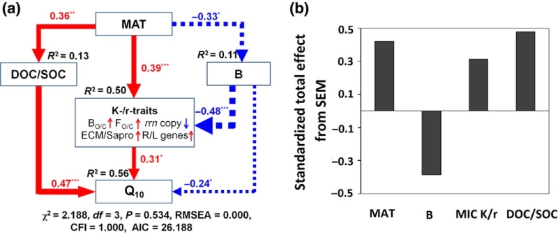 图1 基于结构方程模型(SEM)分析年均温(MAT)、有机质质量和有效性、微生物生态策略对有机质矿化温度敏感性(Q10)的直接效应和间接效应