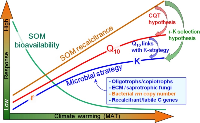 全球变暖加速土壤有机质(SOM)分解和CO2释放,研究SOM分解的温度敏感性(Q10)对全球变暖的响应,对于未来气候变化下的全球碳收支预测至关重要。然而,由于Q10、SOM质量和微生物生态功能之间的复杂关系,Q10对持续增温的响应趋势及其驱动机制尚存在较大争议,特别是缺乏微生物基因组学相关证据支持。