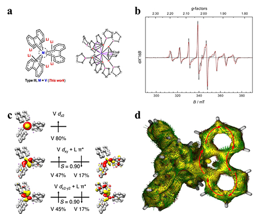 本工作合成了一种三环钒杂螺芳香化合物,电子顺磁共振(EPR)测试表明该化合物的基态为二重态,并且单电子主要位于金属中心上。根据X射线光电子能谱(XPS)的结果推测,该化合物中钒的氧化态最有可能高于正三价。DFT计算结果表明,合成的三环钒杂螺芳香化合物中钒中心的dxy和dx2-y2两个d轨道与三个配体的 *轨道组合形成分子轨道,使钒中心的4个d电子很大程度地离域到三个配体上。NICS计算值、电子定域化函数(ELF)和各向磁感应电流密度(AICD)分析表明,钒中心提供的四个d电子与配体本身的36个 电子共同形成一个包含三个金属杂芳香环的40 芳香体系。此外,理论计算还表明,锂离子对芳香性有不可或缺的作用,而螺原子的种类也对电子离域程度有影响。本工作成功合成了三环钒杂螺芳香化合物,并揭示了过渡金属的加入可以实现其芳香性结构。