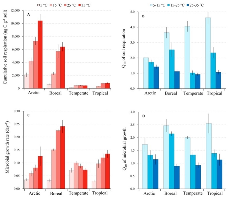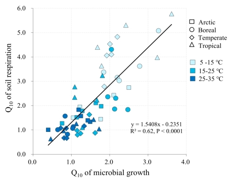 图1. 土壤呼吸速率、微生物生长速率以及各自的温度敏感性