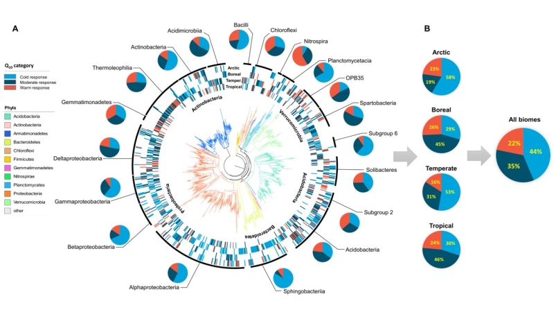 全球变暖引起土壤微生物生理活性的变化与土壤有机碳分解间的关系还存在诸多不确定性。基于此,沈阳生态所王超副研究员与美国西弗吉尼亚大学、北亚利桑那大学等单位的学者进行合作,从热带、温带、寒带和北极采集土壤进行增温模拟实验,利用qSIP技术量化了土壤微生物的生长速率及其温度敏感性,同步测量土壤有机碳的矿化速率和温度敏感性,结果发现:1)增温加速了土壤有机碳的矿化速率,但是降低了有机碳矿化速率的温度敏感性。同样,增温促进了微生物的生长速率、降低了微生物生长速率的温度敏感性(图1);2)线性回归分析发现微生物生长速率的温度敏感性与土壤有机碳矿化的温度敏感性存在极显著的正相关性(图2),说明土壤微生物活性对温度的响应是调控土壤碳释放的关键因子;3)研究计算了每个微生物物种水平上的生长速率及其温度敏感性,发现微生物生长速率的温度敏感性具有显著的生物进化特征,即同一门或纲分类下的微生物的温度敏感性数值相近(图3)。这项研究表明,每个微生物的生理特征直接调控整个群落的功能性状,进而会影响土壤的物质循环过程。本研究首次量化了增温对土壤微生物生长速率的影响,为构建具有微生物属性的全球变化模型提供了强有力的数据和技术支持。