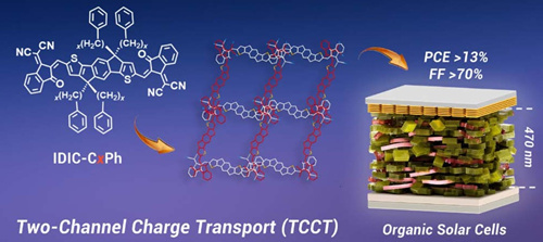最近,青岛能源所先进有机功能材料与器件研究组在前期非富勒烯受体的新型侧链工程研究基础上(Adv. Mater., 2019, 31, 1807832; Adv. Funct. Mater., 2020,30, 2007088等),进一步系统研究并深入揭示了烷基侧链的影响,实现了对分子堆积、捕光层形貌及电荷传输更为精细的调控。研究发现侧链烷基碳数细微调控对共轭材料分子堆积方式展现出截然不同的影响,在侧链碳数为5时的IDIC-C5Ph受体中存在奇特的分子堆积,我们首次提出了双通道电荷传输(TCCT)概念,可实现了电荷更为高效的传输与提取。光伏性能结果表明,IDIC-C5Ph基器件最优条件下的填充因子(FF)可高达80.02%,是常规有机光伏器件中的最高值之一。考虑到TCCT特性在电荷传输及抑制复合方面的优势,IDIC-C5Ph基器件随着膜厚增加到307 nm时FF仍然高达75%,媲美大多数报道的低膜厚器件数据;进一步增加到470 nm时,FF依然大于70%,PCE达到13%。与之对比,常规单通道电荷传输的IDIC-C4Ph器件,最优膜厚105 nm时具有较高的FF(78.05%)和转换效率,但随着厚度增加FF明显降低(300 nm, FF=70.12%; 485 nm, FF=65%)。这些结果表明侧链诱导的TCCT特性赋予电池低的膜厚敏感性,对大面积电池印刷制备具有重要推动意义。