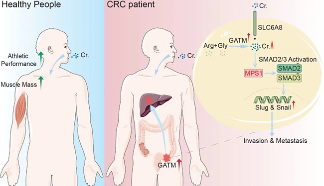 癌症转移是造成癌症患者死亡的主要原因,也是癌症治疗的困难所在。本工作中研究人员建立了肠癌的原位小鼠模型模拟肠癌的发生发展过程,并发现补充肌酸能够在一定程度上抑制小鼠原位肠癌的生长,却显著地促进肠癌的转移、缩短了荷瘤小鼠的存活时间。进一步利用临床组织和小鼠模型研究发现,肌酸合成的限速酶GATM在肝转移的肠癌组织中表达高;抑制GATM的表达或者酶活能够显著地抑制肠癌的转移,延长荷瘤小鼠的存活时间。研究人员发现,机制上肌酸能够通过激活TGF- 下游效应分子SMAD2/3,上调癌症转移分子SLUG/SNAIL的表达,促进肿瘤细胞的浸润和转移。