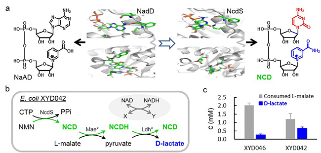 本研究以烟酸单核苷酸(NaMN)腺苷酰转移酶(NadD)为模板,半理性设计并改造其底物NaMN和腺苷三磷酸(ATP)的结合口袋,获得偏好烟酰胺单核苷酸(NMN)和胞苷三磷酸(CTP)的突变体,即NCD合成酶(NcdS)。该团队在大肠杆菌中表达NcdS,实现利用内源的CTP和NMN合成NCD;通过强化前体合成步骤,胞内NCD含量可超过天然辅酶,达到5.0mM,获得NCD自给型平台菌株。此外,该团队还通过表达NCD偏好型苹果酸酶和D-乳酸脱氢酶,实现NCD介导的L-苹果酸高选择性转化为D-乳酸。该工作为细胞内合成非天然辅酶奠定了基础,为后续合成生物学和化学生物学研究提供了参考。