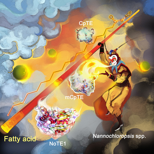 作为一种“负碳”的细胞工厂,工业微藻能够在光能驱动下,将二氧化碳和水规模化地转化成各种链长的脂肪酸(从C8到C22以上),但每种工业微藻的脂肪酸链长组成通常稳定且具物种特异性,因而难以灵活可控地合成各种链长的脂肪酸分子。针对此瓶颈问题,单细胞中心的王勤涛助理研究员和大连理工大学的冯延宾副教授带领的研究小组,在工业产油微藻——海洋微拟球藻中,发现一个定位于细胞质中属于PKS系统的二类酯酰-ACP硫酯酶NoTE1,能提高C16和C18的含量并降低C20的含量,从而可用于理性调控长链和超长链脂肪酸的相对含量。