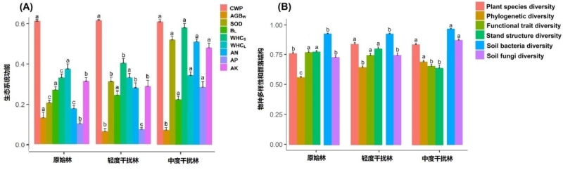 图1 不同(择伐)干扰水平对森林生态系统功能(A)、物种多样性及群落结构(B)的影响