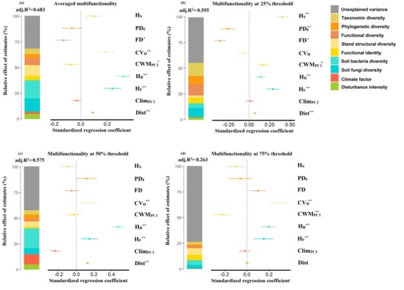 图2 气候因子、干扰强度、植物属性和土壤微生物对生态系统多重功能的相对贡献