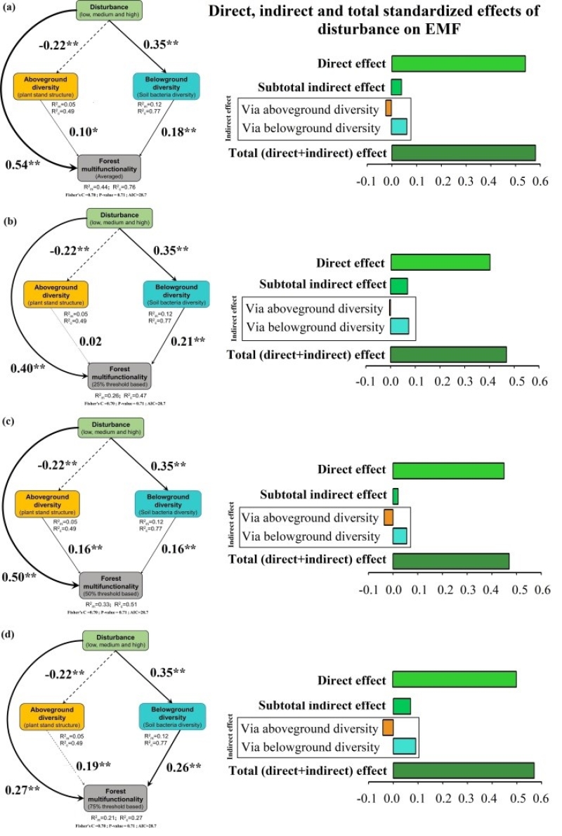 鉴于此,中国科学院沈阳应用生态研究所天然林生态课题组成员在长白山区分别选取未经过择伐干扰(原始林)、轻度择伐(10~20%强度)和中度择伐(20~30%强度)干扰的3种林型共11块样地为研究对象,测定了群落生产力、土壤碳储量和土壤/凋落物持水能力等9种生态系统功能,综合运用均值法、多阈值法和单功能法度量了生态系统的多重功能,对比分析了气候因子、干扰强度、植物属性和土壤微生物对生态系统多重功能的相对贡献。结果发现:1)群落生产力、地被物生物量和持水力在三个林型中没有显著差异(图1A),经过择伐森林中土壤有机碳密度、土壤持水力、土壤有效氮、有效磷和有效钾等功能指标甚至已超其初始状态(原始林),表明该区域曾受择伐干扰的次生林具有较强的自我恢复力。2)择伐后次生林在恢复过程中,物种多样性和林分结构表现出不同的变化趋势。例如,尽管受中度干扰森林具有较低的功能性状多样性和林分结构多样性(图1B),但其比原始林拥有更高的物种、谱系和土壤微生物多样性。3)植物属性(如分类、谱系、功能性状和林分结构多样性)对不同多重功能指数同时具有或正或负的影响,土壤细菌多样性和林分结构多样性对多重功能具有较强的预测力,而气候因子的影响相对较小(图2);4)地上和地下生物多样性在干扰对多重功能的调节作用中存在相反路径(图3)。该研究表明合理择伐可能使林地资源得到充分利用,促进保留木生长和提升生态系统整体功能,并且能提高树种和土壤微生物多样性,是调控森林生物多样性和生态系统功能的有效手段。