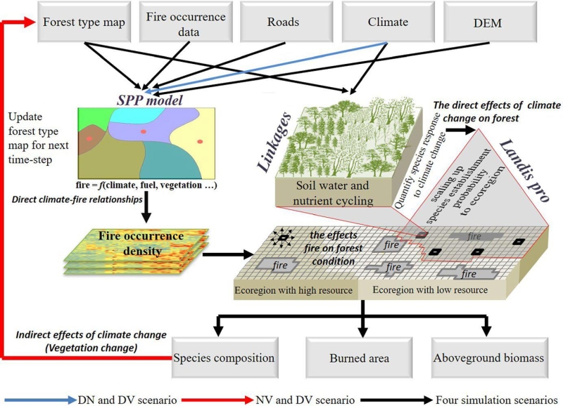 沈阳生态所景观过程组研究团队以中国东北大兴安岭北方针叶林为研究对象,通过建立基于LANDIS PRO和LINKAGES的模型耦合框架,并整合气候变化的直接和间接效应来预测我国北方针叶林林火发生概率和火烧面积。此外,通过设计因子实验来量化气候变化的直接效应、间接效应以及两者的交互作用对北方针叶林林火干扰特征在短期(2000-2050)、中期(2060-2100)和长期(2150-2200)影响中的相对重要性。结果表明,对21世纪的火干扰特征来说,气候变化的直接效应要高于其间接效应。在2100-2200年林火发生概率和火烧面积的增加将会加速北方针叶林向温带森林的转变,进而降低林火发生概率和火烧面积。因此,植被的变化将会在长时间尺度上调节气候变化对北方针叶林林火干扰模式的直接效应。本研究的结果表明在气候条件变化的背景下,决策者可以考虑适应性管理,通过种植落叶树种来降低林火发生概率,以及通过减少促进北方针叶林树种间的竞争来进行抗性管理。