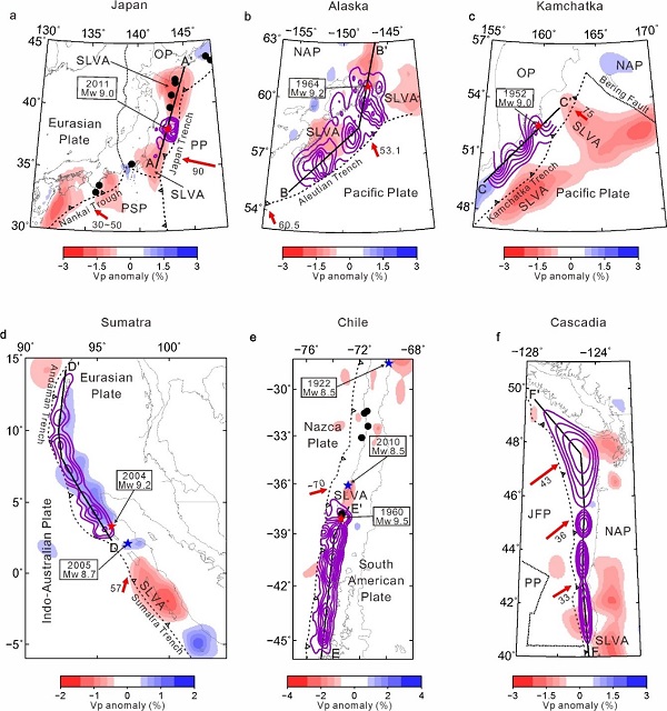 针对此问题,研究团队利用最新的被动源海底地震仪(OBS)和陆地台站记录的天然地震数据对全球多条俯冲带进行了高分辨率的层析成像反演。结果显示,在这些俯冲带的弧前地区,俯冲板块之下的软流圈均表现出低速异常特征,将其与全球6个9.0级以上大地震的震中及破裂范围进行对比发现,大地震的震中均位于低速异常空白区或其边缘,大地震的同震位移较大的破裂范围大致对应于低速异常空白区。