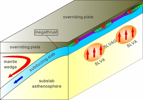 研究认为,俯冲板块之下的软流圈低速异常所产生的上浮力提高了板间界面地震破裂的临界应力值,而在低速异常空白区上方的板间界面,其地震破裂的临界应力值要稍小于低速异常上方的板间界面,因此,大地震更容易在低速异常空白区上方发生。另外,大洋软流圈低速异常所产生的较大上浮力可能导致俯冲板块界面抬升,增强板间剪应力,或者高温的低速异常可能通过热传导或热侵蚀,导致板间界面的流变性由摩擦转变为粘性剪切,这两种因素可能共同阻碍了大地震的破裂传播。