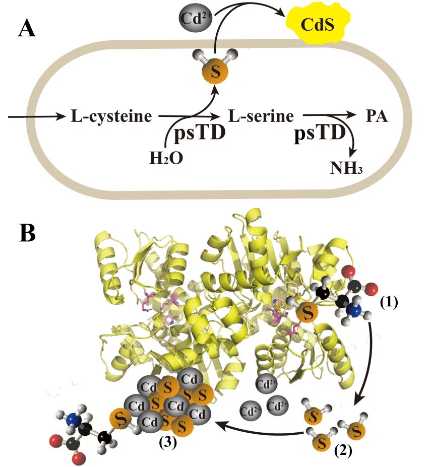 重金属镉在深海环境中广泛存在,深海微生物进化出了成熟且多样的镉耐受机制以维持在镉环境中的生长和繁殖。与此同时,环境中与镉共存的化合物如半胱氨酸可显著影响深海微生物的镉抗性。在研究一株深海假单胞菌镉耐受机制的过程中,发现半胱氨酸的存在可以有效促进细菌形成硫化镉纳米颗粒,进而显著提高细菌的镉抗性和脱除率(图1)。通过蛋白质组学和基因敲除等方法发现该菌产生的苏氨酸脱水酶(threonine dehydrase, TD)具有半胱氨酸脱硫酶活性,该酶通过催化半胱氨酸脱硫生成硫化氢来参与细菌的镉耐受过程。通过TD的异源表达和分离纯化进一步确定了重组苏氨酸脱水酶(rTD)在胞外仍具有半胱氨酸脱硫酶活性,并分析了其催化反应的过程。