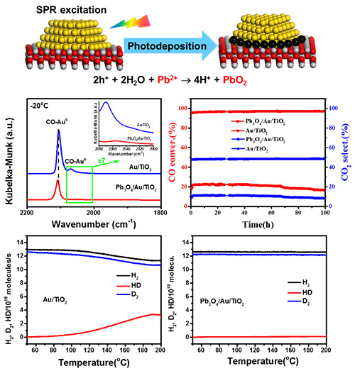 近日,中国科学院大连化学物理研究所院士李灿团队与研究员黄家辉团队合作,采用自主发展的等离激元辅助光沉积策略(J. Am. Chem. Soc.,2017),在Au-TiO2界面处选择性沉积惰性的铅氧化物,从而封堵高活性的Au-TiO2界面位点,将反应活性中心从非选择性的界面区域转移到高CO选择性氧化的金属表面区域,最终实现优异的CO-PROX催化反应性能。