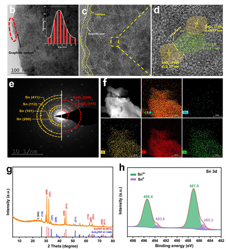 在电催化还原氮气制氨反应方面,开发了以简单的碳热还原策略,通过控制热解时间制备了具有Sn-SnO2和Sn-NC双界面结构催化剂Sn-SnO2/NC(图3),实现了室温常压条件下电催化氮还原反应(-0.05 V vs RHE, 0.1 M Na2SO4溶液),催化活性超过目前已报道锡基催化剂电催化氮还原活性。实验结果结合DFT理论计算表明,相比于单一界面Sn/NC和SnO2/NC催化剂,Sn-SnO2/NC催化剂中独特的双界面结构不仅有效提高了催化活性位点的暴露,促进N2分子的吸附和活化,同时加快了电子在界面处的转移,并降低了决速步(N2*—*NNH)的能垒,进而通过协同作用机制加快了电化学氮还原反应动力学过程。该研究为通过界面调控策略开发高效电催化剂材料提供了新的研究思路。相关研究结果发表在ACS Appl. Mater. Interfaces 2021, 13, 15270–15278