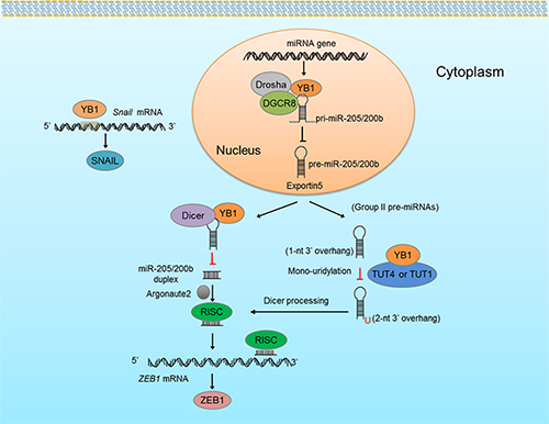 癌症转移是造成癌症患者死亡的主要原因,也是癌症治疗的困难所在。本工作中,研究人员发现YB1与miRNA微处理器复合物DGCR8、DICER及终端UTP转移酶TUTs的相互作用,可显著地抑制miRNA-200b和miRNA-205生物学合成及其表达,进而上调癌症转移关键蛋白ZEB1的表达;通过尾静脉注射的小鼠模型,模拟癌症肺癌转移发生发展过程,发现YB1可以促进肝癌细胞的肺部转移;进一步利用临床组织研究发现,肝癌组织中YB1与ZEB1表达正相关,并与miRNA200和miRNA205b的表达负相关,最终发现miRNA200/205b-ZEB1信号通路与患者的预后具有显著地相关性。