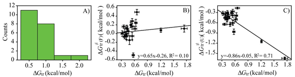 图2. 蛋白质折叠转移自由能( Gtr)的性质:A) 所有测量的GB3突变体的折叠转移自由能; B)和C)分别为折叠转移自由能和折叠态相对转移自由能及解折叠态相对转移自由能之间的相关性。