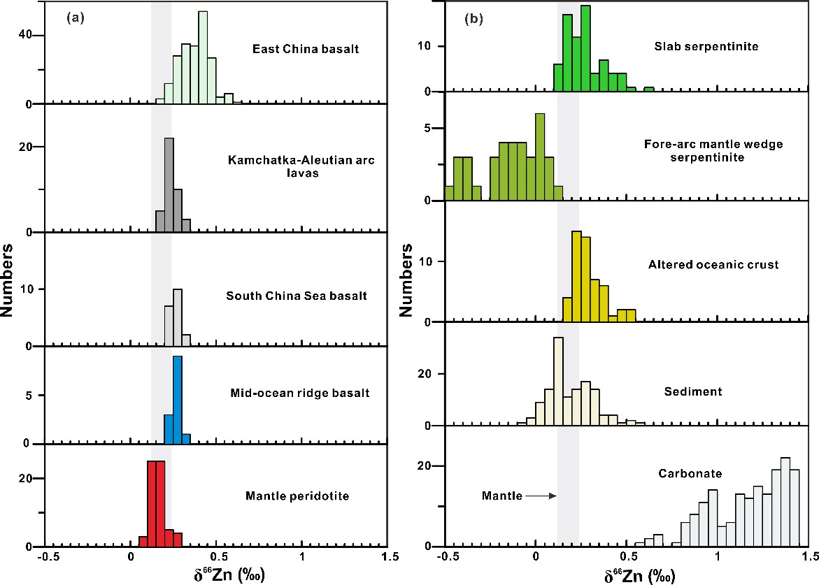 不同岩石(a)及潜在的俯冲组分(b)Zn同位素组成