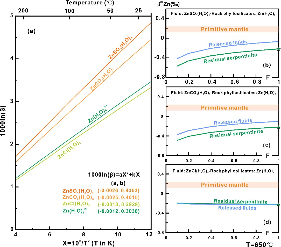 近年来,随着金属稳定同位素的发展,不同端元的锌(Zn)同位素组成特征已得到很好的限定。综合前人数据,团队研究发现板片蛇纹岩和弧前蛇纹岩存在截然不同的Zn同位素组成,结合已有第一性原理理论计算值评估了弧前蛇纹岩在弧下深度脱水过程中与不同流体之间的Zn同位素平衡分馏系数及其释放流体的Zn同位素组成。结果表明,弧前蛇纹岩脱水释放的流体相对地幔楔具有显著低的Zn同位素组成。因此,弧前蛇纹岩流体交代地幔楔理论上会造成岛弧岩浆Zn同位素组成偏轻。