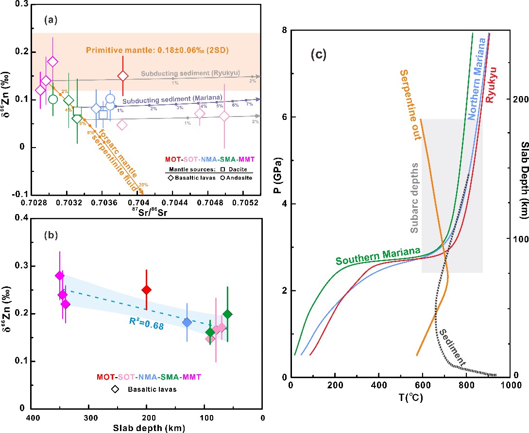 为了验证这一科学推论,团队分析了马里亚纳和琉球岛弧对应不同板片深度的火山岩样品。结果显示,马里亚纳岛弧和冲绳海槽南部火山岩样品Zn同位素组成比洋中脊玄武岩(MORB)低,而马里亚纳海槽和冲绳海槽中部火山岩Zn同位素组成与MORB一致,且 66Zn与流体活动性指标(87Sr /86Sr和Ba/La)以及板片俯冲深度具有很好的相关性。