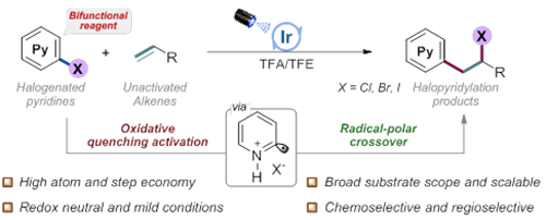 近日,中国科学院大连化学物理研究所仿生催化合成创新特区研究组研究员陈庆安团队在光催化烯烃的卤代/吡啶双官能化方面取得新进展,发展了一种通过调控氧化淬灭活化模式和自由基极性交叉途径,实现光催化非活化烯烃的卤代/吡啶双官能化反应新策略。该策略作为对传统Heck型反应的补充,通过自由基反应过程避免了中间体 -H消除带来的底物限制,高效的将卤代基和吡啶基团区域选择性地加成到烯烃双键。