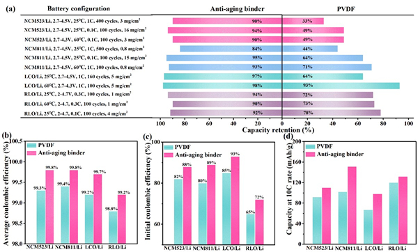 图1 抗衰老粘结剂和传统的PVDF粘结剂在多种层状氧化物锂电池中的性能对比