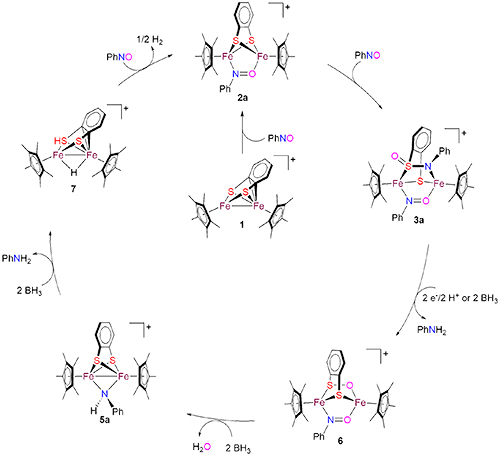 本工作中,研究团队采用X-射线单晶衍射、核磁共振波谱、红外光谱、和零场57Fe穆斯堡尔谱等方法对邻苯二硫酚桥联双铁配合物([Cp*Fe( - 2: 4-bdt)FeCp*][PF6](Cp*= 5-C5Me5))进行了详细的表征。研究发现,在该双铁反应体系中,铁硫协同实现了PhNO的N=O键切割,其中硫配体插入N=O键高选择性地生成了稳定的苯基亚磺酰胺配合物。研究团队还通过计算化学对苯基亚磺酰胺基的形成过程进行了详细的研究,结果表明,在该过程中,硫配体作为电子供体对PhNO实现了四电子协同还原,而铁中心仅作为电子穿梭载体。此外,该硫桥联双铁体系还可以在温和的条件下,利用硼烷高效催化PhNO还原转化为苯胺。详细的反应机制研究表明,相比于桥联的PhNO配体,苯基亚磺酰胺配体能够优先发生还原释放苯胺。苯基亚磺酰胺配合物的生成加速了PhNO还原转化为苯胺的过程,这为认识生命体系中PhNO还原代谢过程提供了新思路。