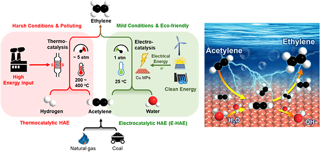 电化学乙炔加氢制乙烯与传统热催化方法的对比(左图)及其示意图(右图)