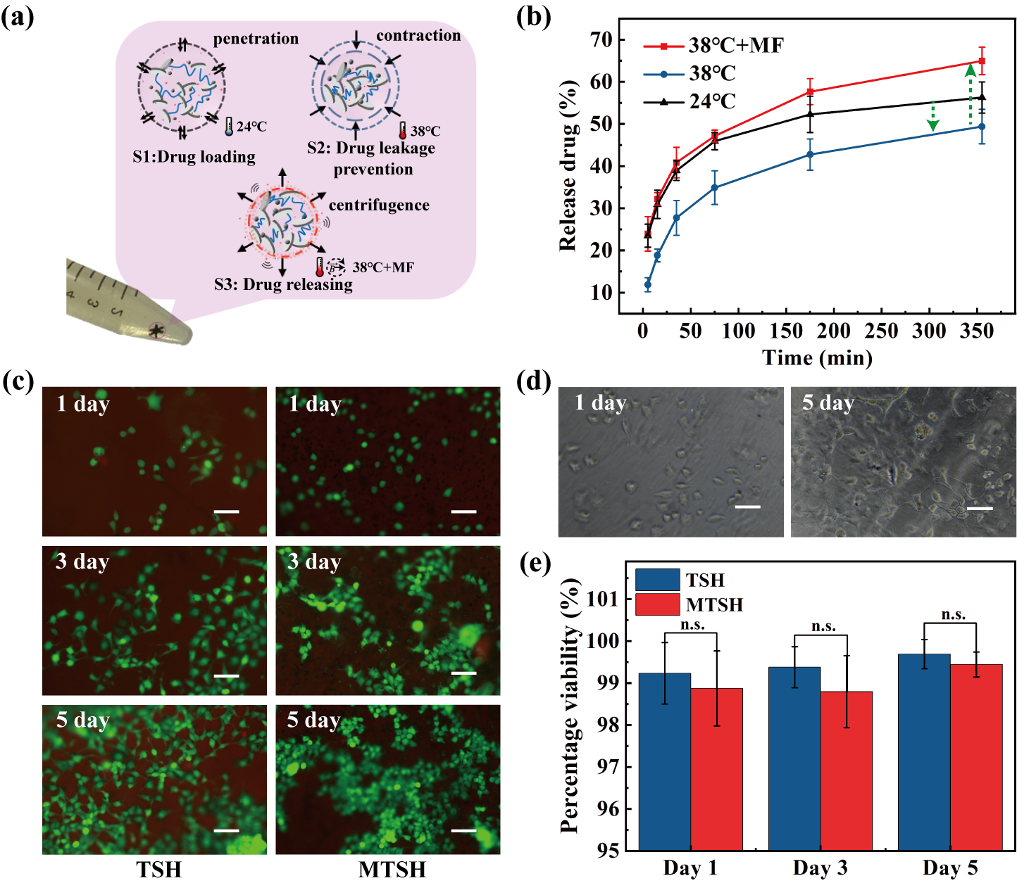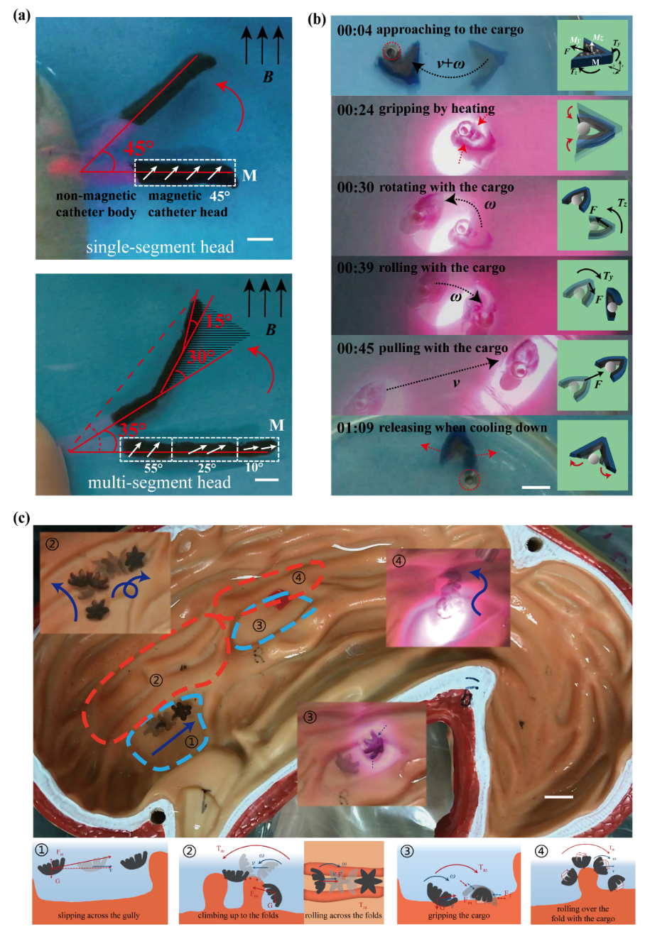 沈阳自动化所微纳米课题组的科研人员合成了一种由温敏水凝胶(NIPAM)、纳米粘土(Laponite)和磁性颗粒(NdFeB)组成的新型磁性温敏智能水凝胶。水凝胶除了具有可调节的生物物理特性和变形能力外,还具有极佳的生物相容性。从自然界中的生物获得灵感,在外部磁场中利用多材料4D打印技术加工了仿水母和仿扇贝等软体机器人。仿水母机器人可以在外部磁场驱动下以平移、旋转、翻滚形式运动,翻过人胃模型中的褶皱,完成微结构的主动夹取和搬运。在外部磁场和近红外光产生的热场的协同作用下,机器人可以作为药物的载体并减少药物运输过程中的药物泄漏。4D打印毫米级软体机器人将推动机器人在生物工程和医疗领域的应用。