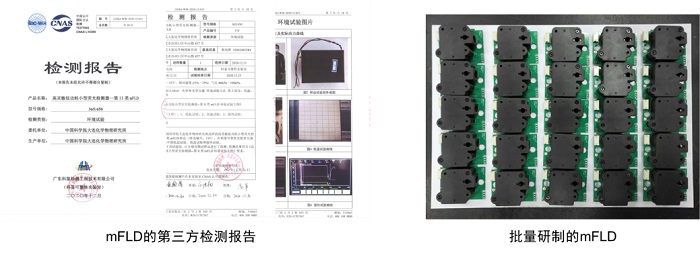 mFLD作为关键部件,被广泛地应用到荧光检测仪器中,对化学污染物、致病微生物等进行检测。该团队研发的单通道mFLD通过了广东科鉴检测工程技术有限公司、大连辽南计量检测院有限公司等第三方检测,结果显示:其对黄曲霉毒素B1的检测限为10ng/L、对荧光素的检测限为2.5ng/L;并具有体积小(43.66cm3)、功耗低(0.31W)、重复测量误差低(0.5%)、平均无故障间隔时间长(18000.4h)等优势;同时,该单通道mFLD也通过了环境试验、安全性测试和可靠性测试。