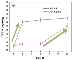图2 在不同放置温度下,在304不锈钢和304-Cu不锈钢餐盘中的冷鲜肉的pH值和盐基氮(TVB-N)值变化情况,(a)4 1 ;(b)23 2 。下角标:1=pH;2=TVB-N