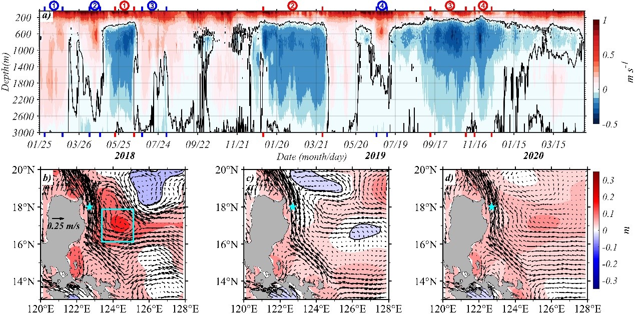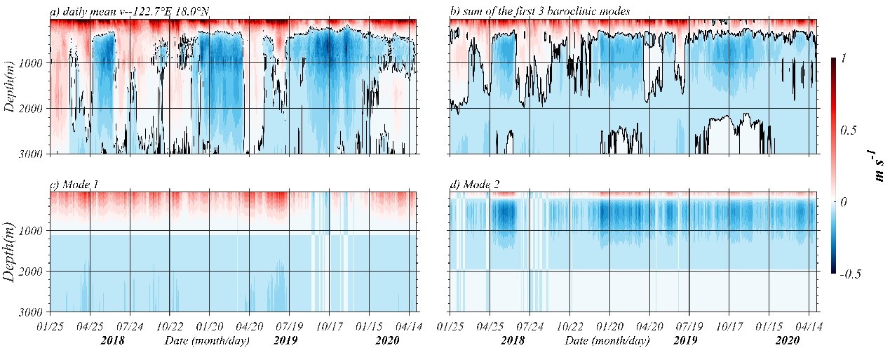 分析发现,上层海洋的中尺度涡旋运动是引发源地黑潮和吕宋潜流变化的关键因素,强劲的海洋上层反气旋涡旋会导致吕宋潜流出现暂时性的减弱乃至反向。研究团队利用垂直模态分解方法研究了不同模态在源地黑潮和吕宋潜流变化中的作用,结果显示第一和第二斜压模解释了黑潮和吕宋潜流的主要垂直结构特征,其中,吕宋潜流发生反向主要是由第一斜压模导致的,但吕宋潜流的季节内变化主要是由第二斜压模导致的。该项研究为认识热带太平洋西边界流系统提供了关键的直接观测证据。